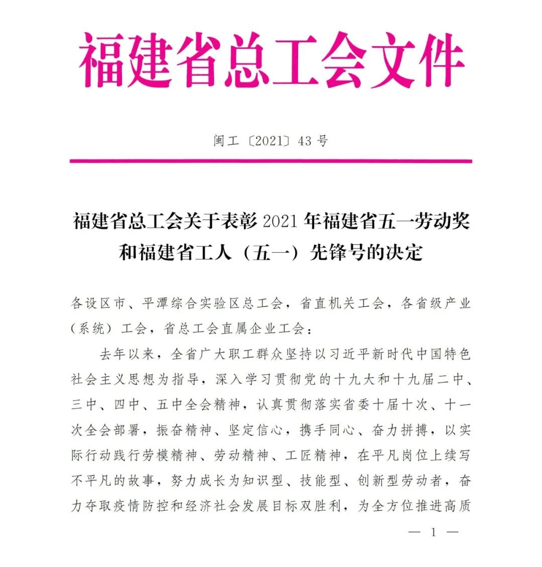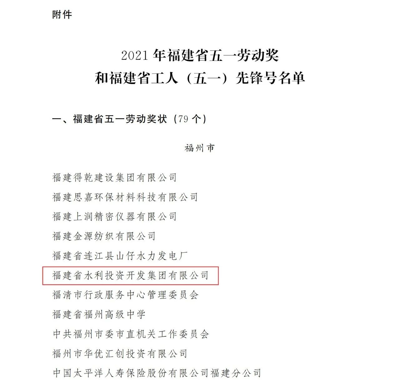 近日,省總工會通報表彰了2021年福建省五一勞動獎和福建省工人 (五一) 先鋒號,福建省水利投資開發(fā)集團(tuán)有限公司榮獲福建省五一勞動獎狀。